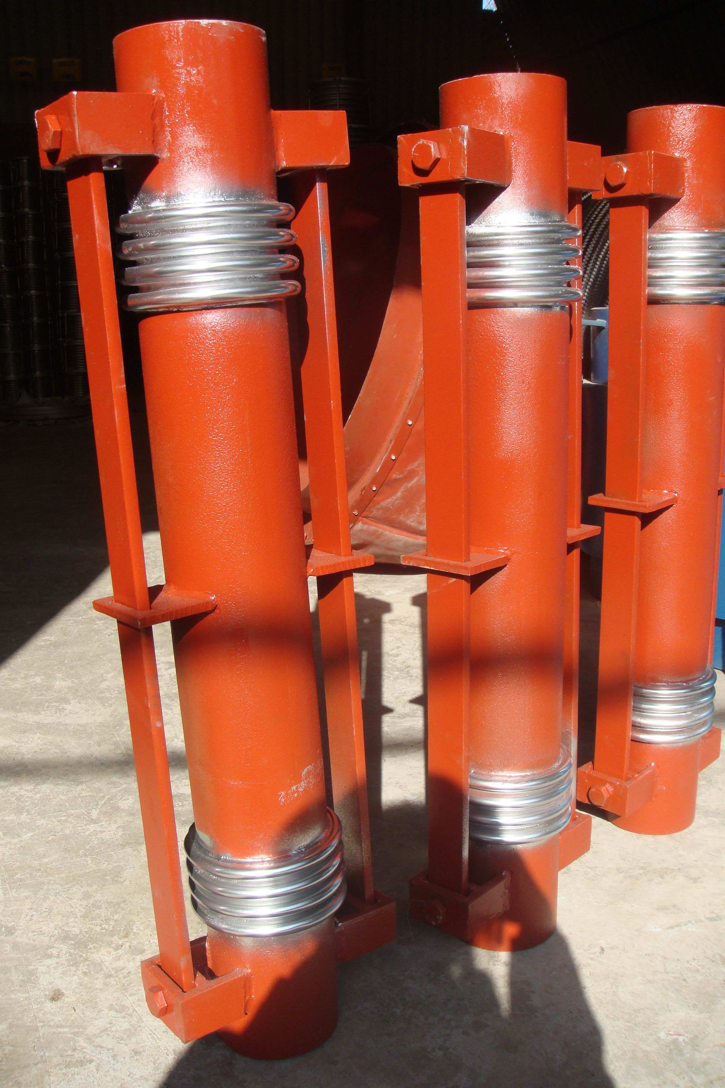 直管力平衡型波纹膨胀节由两个工作波纹膨胀节,一个平衡波纹膨胀节及端板、平衡拉杆组成。其中的关键是平衡波纹膨胀节的有效面积必须是工作波纹膨胀节有效面积的两倍,这样工作波纹膨胀节内压引起的向外侧的轴向推力通过平衡拉杆被平衡波纹膨胀节因内压引起的相反方向的推力所抵消,而无轴向推力输出,管道或设备不再受力在正常的补偿过程中,它自身的力平衡关系不变。